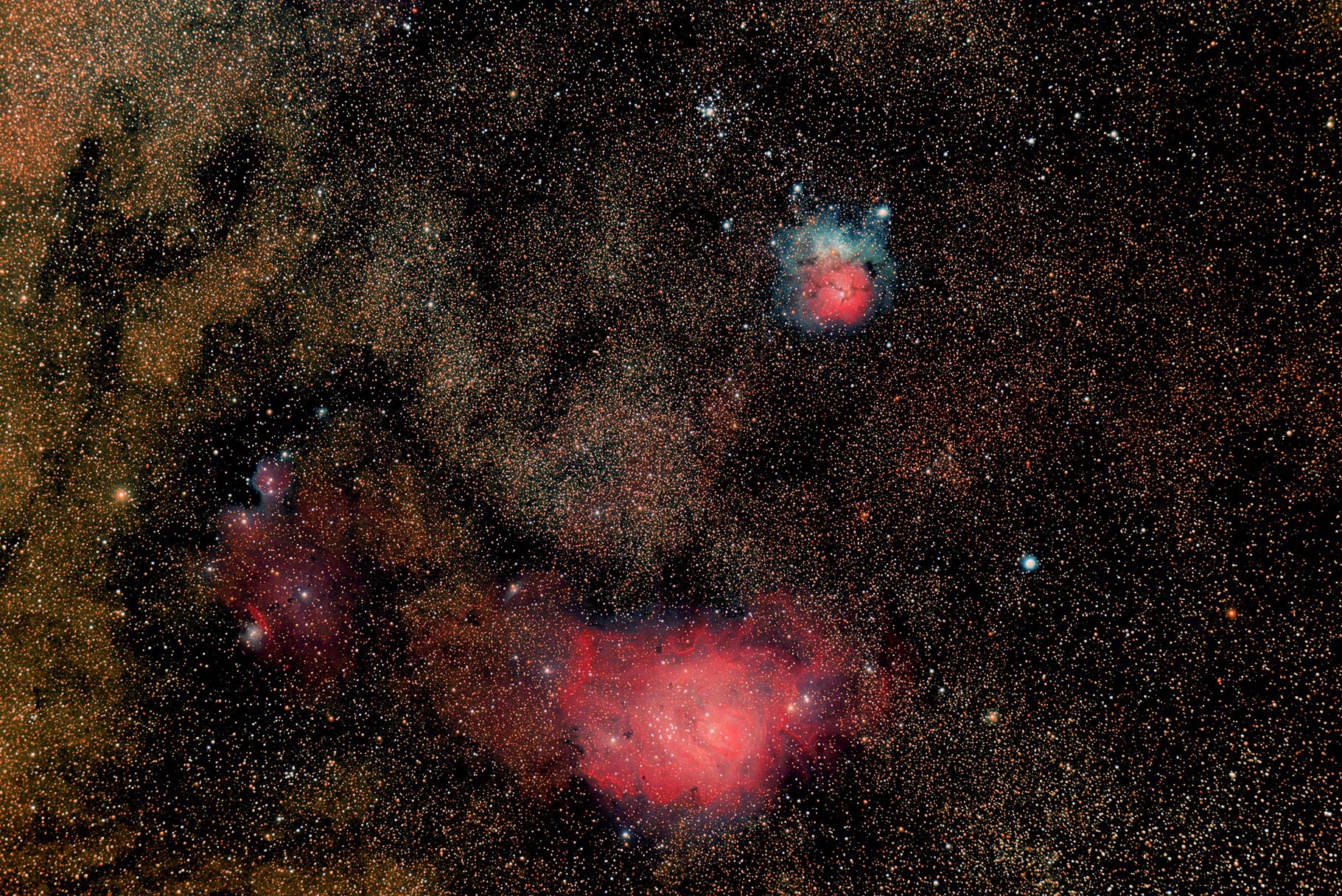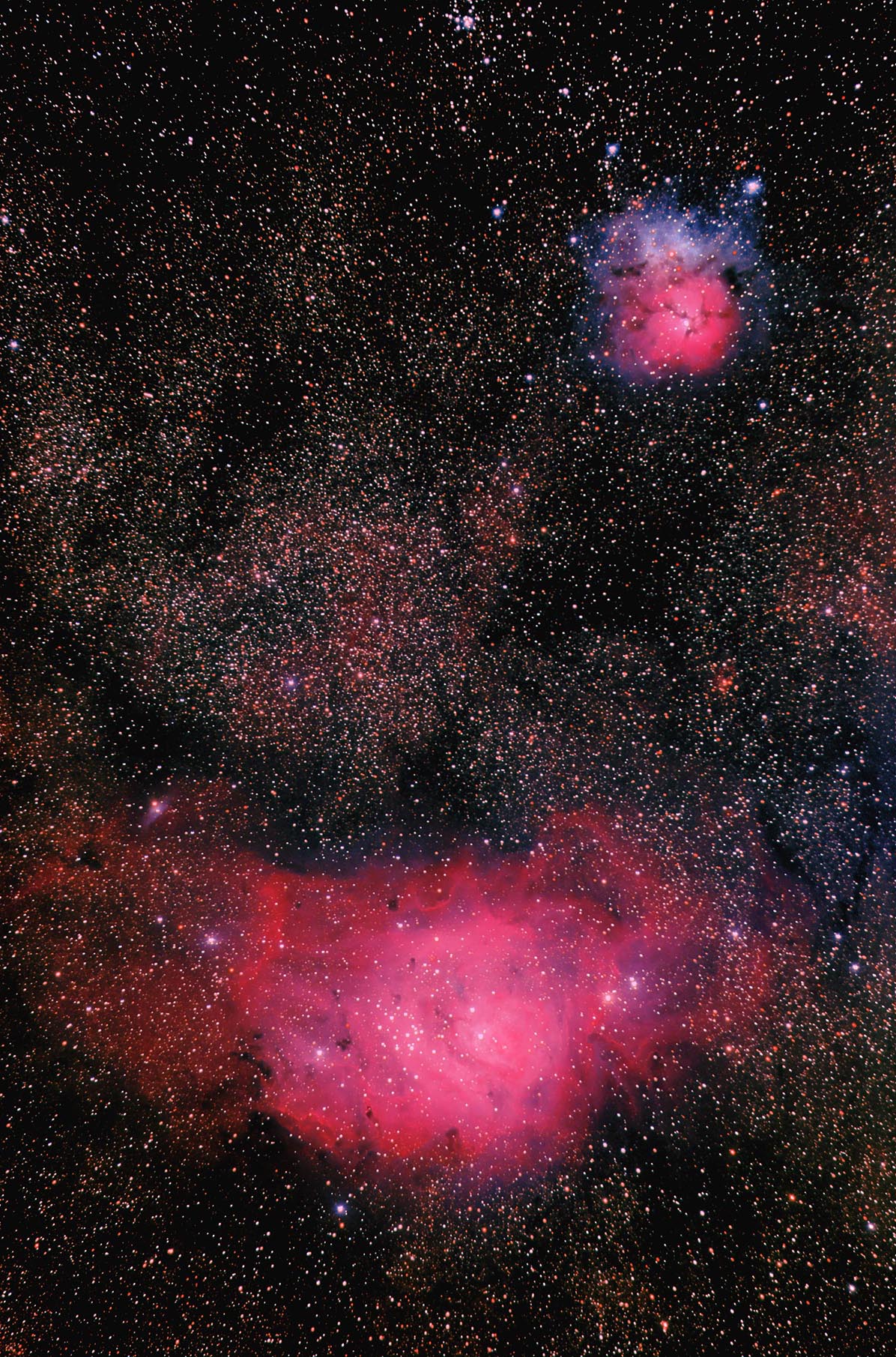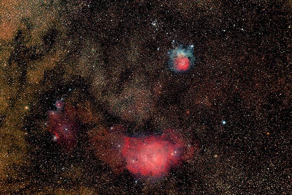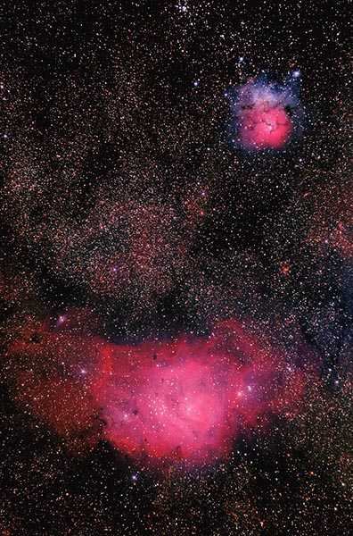 Hier twee opnamen van M8 - De Lagoonnevel- en M20 -De Trifidnevel-. Deze nevels zijn vanuit Nederland in de zomer heel laag aan de horizon in het zuiden te zien. Daardoor kunnen die alleen gefotografeerd worden als je op vakantie een stuk zuiderlijk bent. Deze opnamen zijn dan ook in Frankrijk in de Morvan gemaakt. De afstand tot de Trifidnevel ( de bovenste op de foto) is niet erg nauwkeurig bekend, men noemt meestal een afstand van 2000 tot 9000 lichtjaar voor de Lagoonnevel is dat 5000 tot 6500 lichtjaar. Voor de eerste opname is een lenzenkijker van 92 mm diameter en een brandpunt van 506 mm gebruikt. De tweede foto is met een eigenbouw spiegeltelescoop met een 200mm spiegel die een brandpuntsafstand heeft van 800 mm. Daarom worden de nevels daarmee groter afgebeeld. Bij deze telescoop moet nog gewerkt worden aan een eventuele betere positie van de comacorrector waardoor de sterren in de hoeken zo mogelijk beter afgebeeld worden.