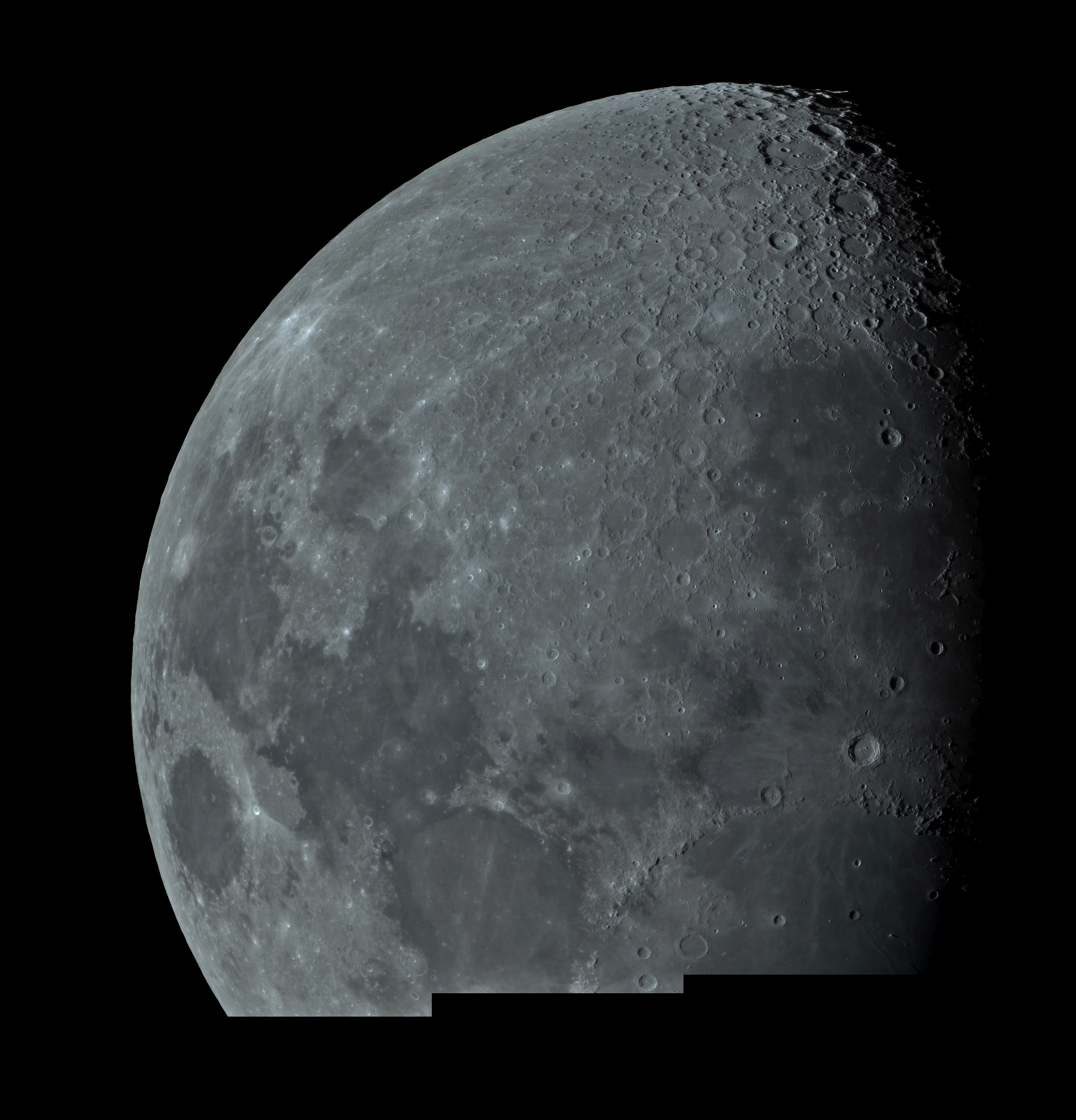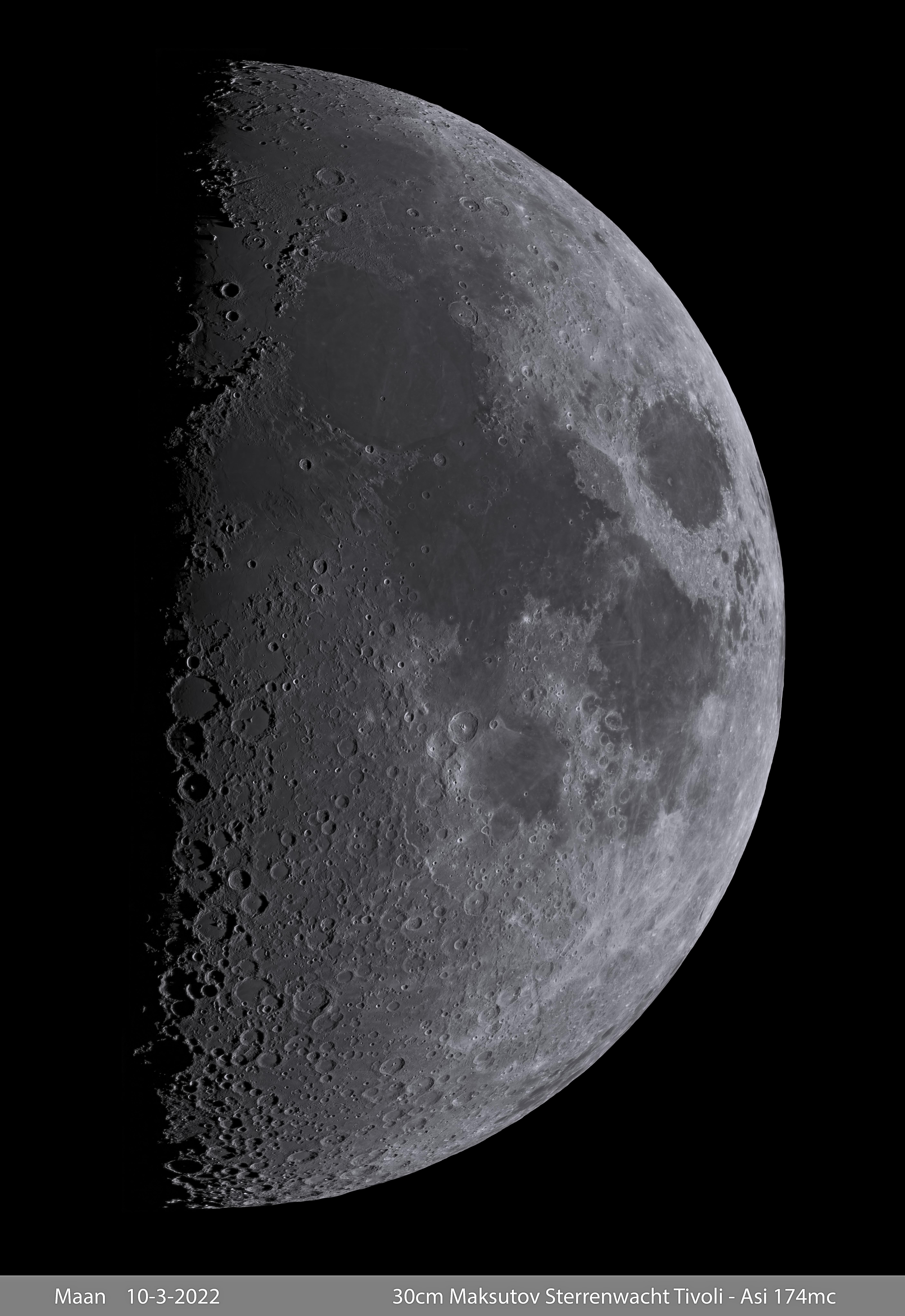 De 30 cm Maksutov kijker is met zijn openingsverhouding van F16 vooral een maan en planeten kijker. Maar een dergelijke kijker is door de grote diameter zeer gevoelig voor de seeing (toestand van de atmosfeer waar we doorheen kijken). Zo is de kleinste vergroting van deze kijker (met oculair van 56 mm brandpunt) al 85 x en daarbij is de invloed van de seeing al aan de orde. Dikwijls zal de scherpte van het beeld nadelig worden beïnvloed waardoor de kijker niet in staat is te laten zien tot wat hij in staat is. Op de avond van 10-3-2022 was er erg goede seeing en de maan was in eerste kwartier hoog aan de hemel zichtbaar, ideale omstandigheden dus om opnamen van de maan te maken. Uit 18 deelbeelden is een mozaïek samengesteld. Klik (2x) op de foto voor de volle resolutie.