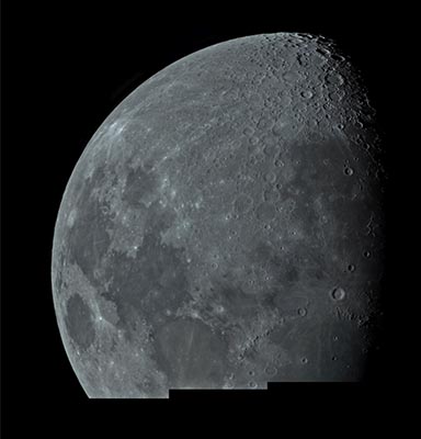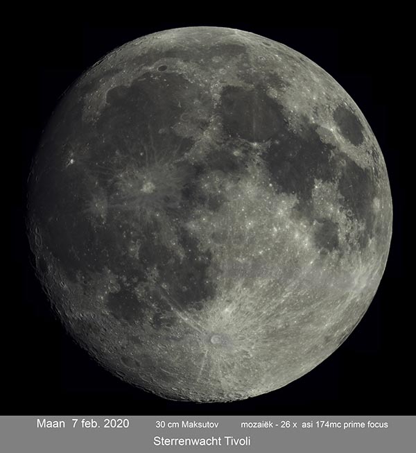 Op 7 feb. 2020 was er eindelijk weer eens een heldere avond. Bij de Sterrenwacht Tivoli In Oudenbosch de 30 cm Maksutov gebruik om een poging te doen een maan mozaïek te maken. Eerst werd een poging gedaan om Venus vast te leggen maar het resultaat liet zien dat de seeing niet best was. De maan stond veel hoger aan de hemel maar daar was de seeing nog steeds niet meer dan redelijk. Ruim 30 filmpjes gemaakt met de Asi174mc in prime focus. Het aantal beeldjes was 3000 waarvan de beste 500 zijn gebruikt om de mozaïek te maken. Door de matige seeing is het beeld tot 50% terug gebracht. Het gevaar bij het maken van een mozaïek is dat bij de uitwerking er stukjes van de maan gemist blijken te zijn en dat bleek hier ook het geval te zijn. Zaak dus om een volgende keer ruimere overlap te kiezen per deelbeeld. Gelukkig kon ik omdat ik de dag eerder ook de maan had gefotografeerd ( wisselwaar met een andere kijker en camera) daarvan gebruik maken om dat gemis weg te werken. Is wel een hoop gedoe want elke dag veranderd het beeld van de maan wat we zien krijgen.