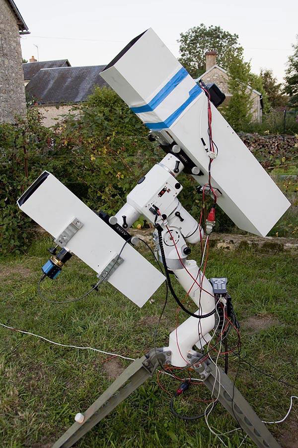 Hieronder m'n mobiele setup. Het is een HEQ6 die ik naar eigen wensen heb aangepast en heb geplaats op een eigenbouw statief volgens Duits-model (knikzuil). Het draagt een 150mm F5 en een 114mm F4 eigenbouw Newton die onderling zowel als hoofdinstrument of als volgkijker kunnen worden gebruikt.