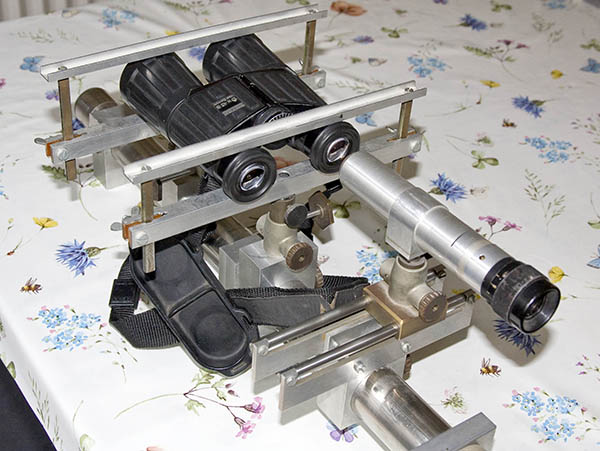 Het komt er op neer, dat je op een stevige ondergrond (een dik stuk geplastificeerd spaanplaat kan al voldoen) de kleine (richt)kijker (bv. de simpele zoeker die bij menig telescoop zit) 6-8 cm kunt verschuiven, zonder dat de richting verandert.