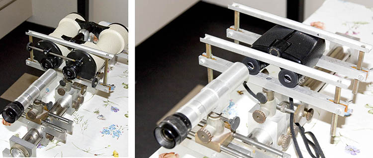 De opstelling bestaat uit twee dragers, waarop de te testen kijker kan worden vast geklemd. Zowel deze dragers als de controlekijker kunnen afzonderlijk in hoogte worden versteld. Door deze opzet kan de opstelling voor grote als kleine kijkers worden gebruikt.