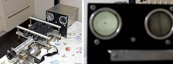 In eerste instantie werd het collimeren gedaan door te kijken naar kruisdraden die door twee objectieven in het oneindige werden geprojecteerd. Maar dat werkte onhandig, omdat als de kruisdraad niet in beeld was, je niet kon zien naar welke kant gecorrigeerd moest worden om hem wel in beeld te krijgen. Daarom heb ik snel die kruisdraden vervangen door een siemensster. Die heeft het voordeel dat je altijd kunt zien waar het middelpunt is.