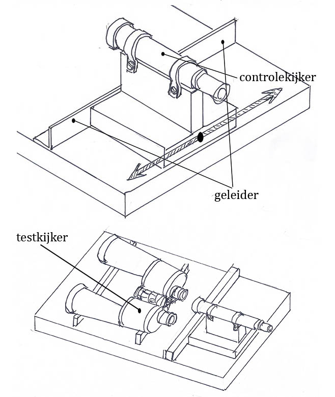 Door nu de testkijker voor het schuifsysteem op te stellen, kan met de controlekijker door elke helft van de testkijker naar een ver object worden gekeken.(Voor het opstellen van de testkijker zal enige creativiteit nodig zijn).