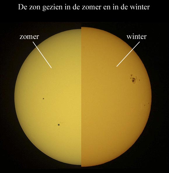 Omdat de aarde niet precies in een cirkel rond de zon draait is de afstand van de aarde tot de zon niet steeds even groot. Zeer tegen de verwachting is het zo dat de aarde s 'winters dichter bij de zon staat dan in de zomer. Onderstaande fotocombinatie laat dit zien. Hier zijn twee opnamen van de zon met precies dezelfde apparatuur bij elkaar gevoegd. Het geeft aan dat de zon in de winter iets groter te zien is als in de zomer. De afstand varieerd van globaal van 147.000.000 tot 152.000.000 km.